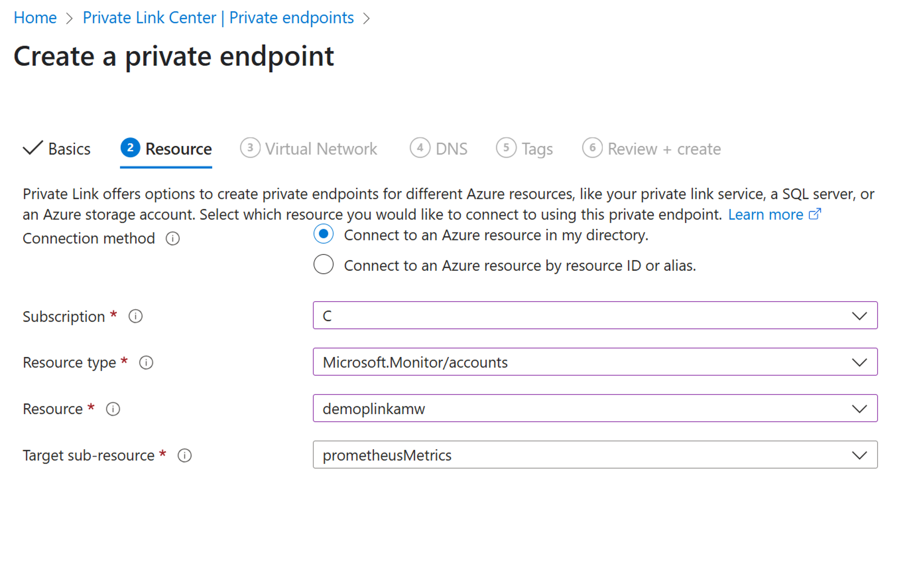 选择资源组并输入专用终结点的名称,然后单击“ 下一步”。