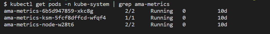 当服务正常运行时,会返回以下格式为 ama-metrics-xxxxxxxxxx-xxxxx 的 Pod 的列表: