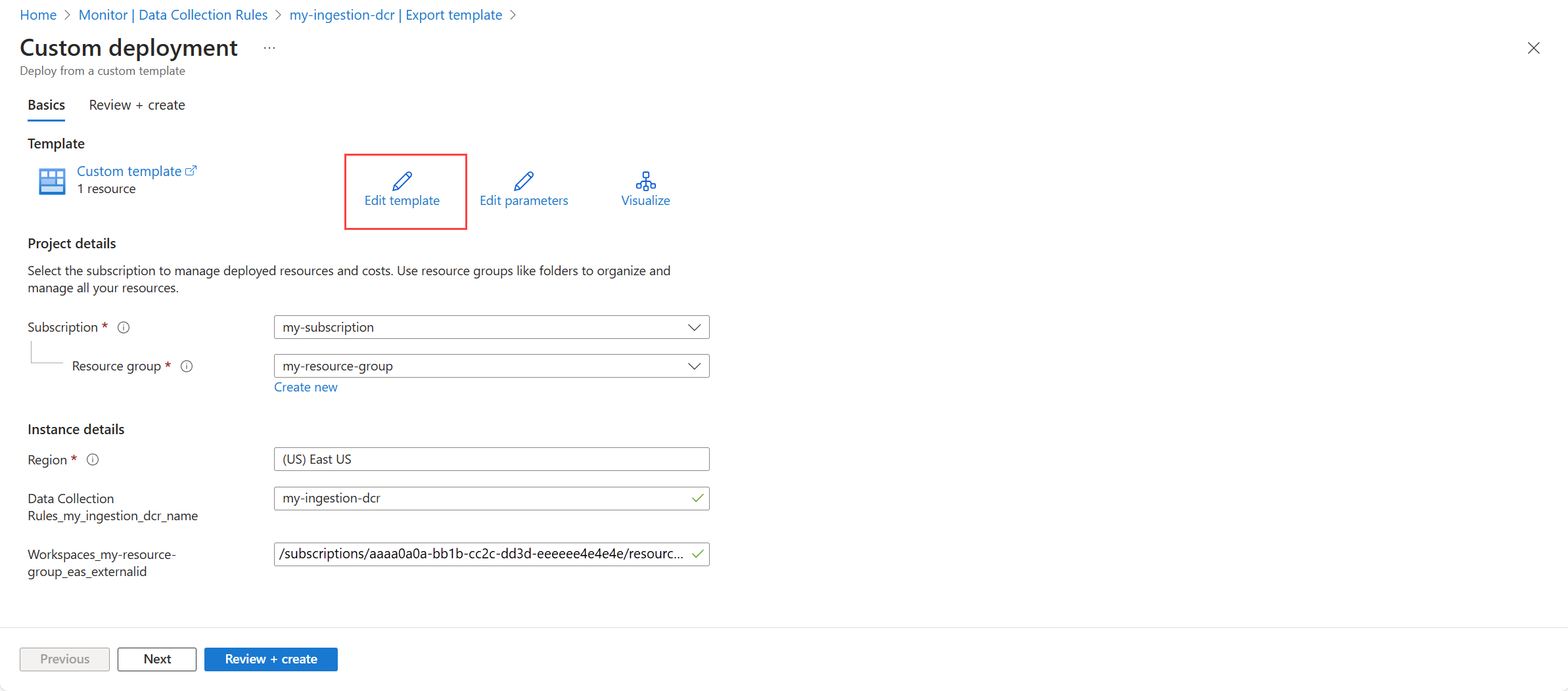 Screenshot 显示 Azure portal. 单击“编辑模板”,打开 DCR 可编辑的 JSON 版本。 请勿更改参数值。