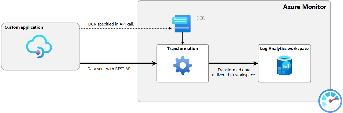 通过直接引入,指定特定的 DCR 来处理传入数据。 例如,下图演示了使用日志引入 API 的自定义应用程序中的数据。 每个 API 调用指定处理其数据的 DCR。 DCR 了解传入数据的结构,包括一个 转换 ,确保数据采用目标表的格式,并指定用于发送转换数据的工作区和表。