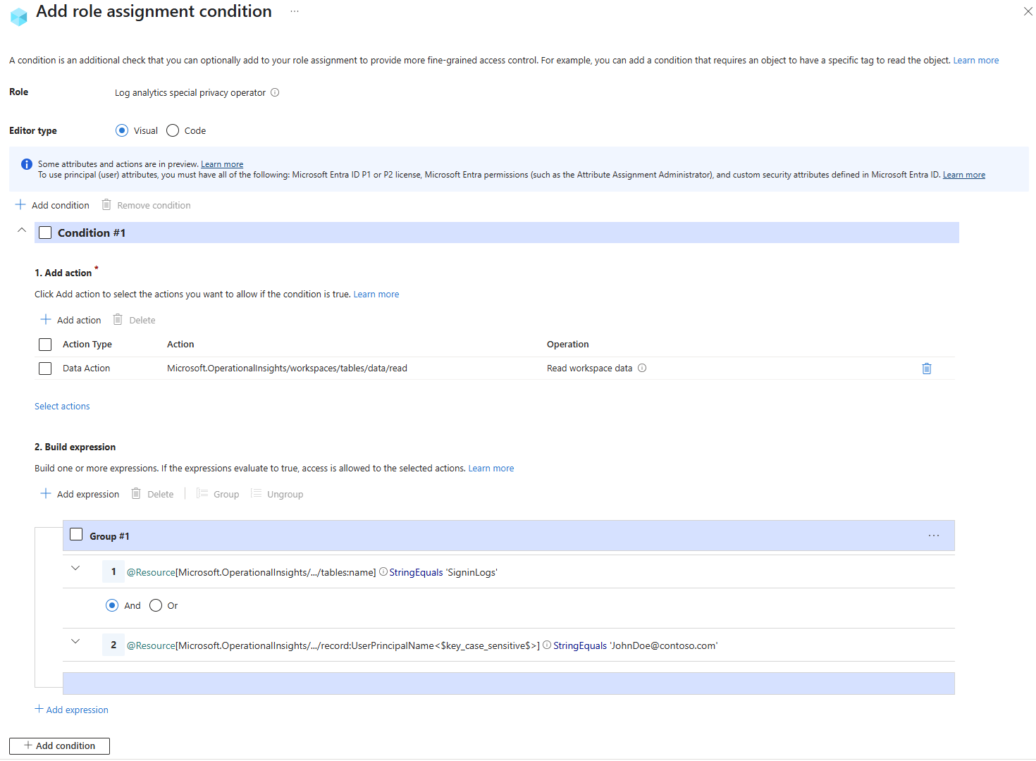 Microsoft.OperationalInsights/workspaces/tables/data/read。 使用数据操作对角色定义条件。