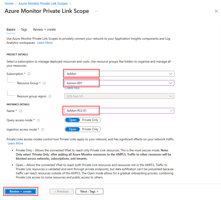 选择订阅和资源组,并为 AMPLS 提供有意义的名称,例如 AppServerProdTelem。