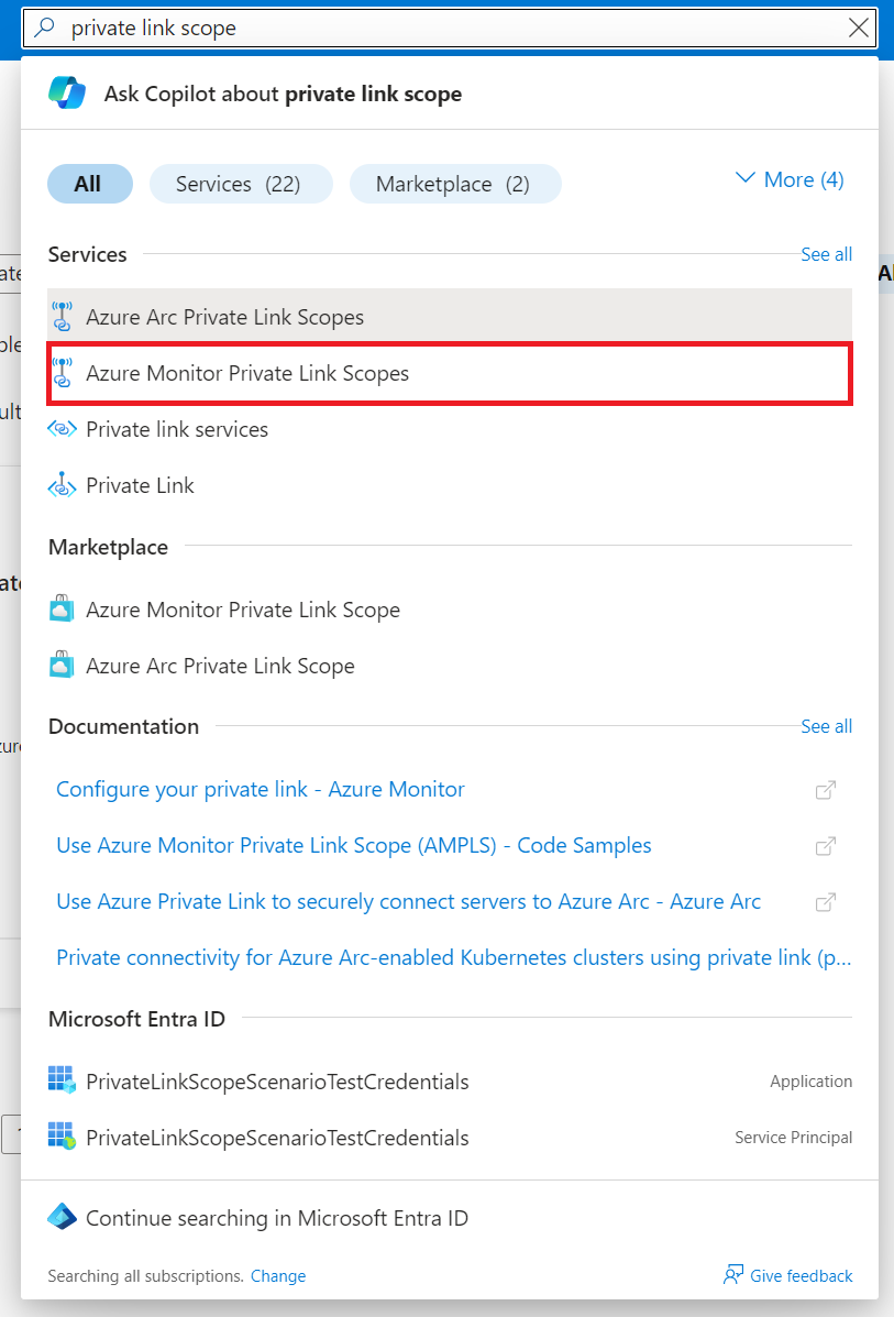 - 选择包含你的 Azure Monitor 专用链接范围资源的订阅。