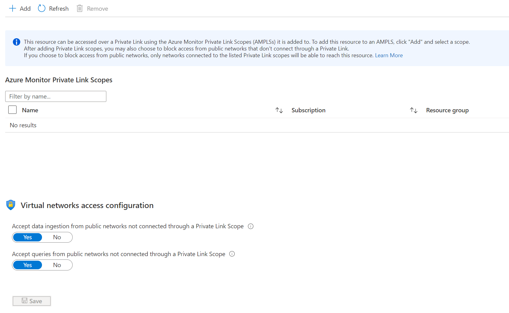 此屏幕允许查看并配置资源与 AMPLS 的连接。 连接到 AMPLS 后,便可以使连接的虚拟网络的流量访问资源。 这种连接效果与连接 Azure Monitor 资源中所述的从范围连接它的效果一样。