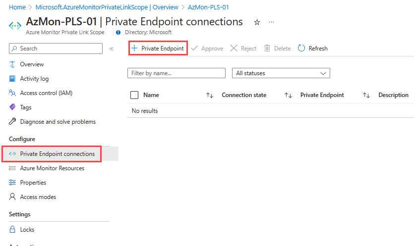 在 AMPLS 菜单,依次选择“专用终结点连接”和“专用终结点”。 你还可批准在专用链接中心启动的连接,方式是将其选中并选择“批准”。