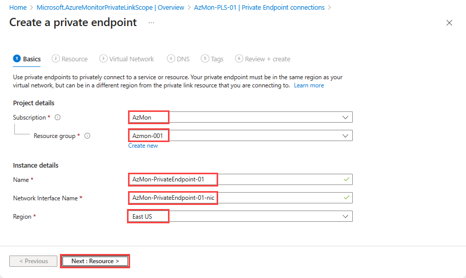 - 选择“订阅”和“资源组”,然后输入终结点“名称”以及“网络接口名称”。