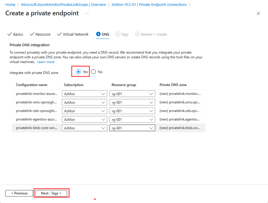 如果选择“否”并且希望手动管理 DNS 记录,请先完成专用链接设置。 包括此专用终结点和 AMPLS 配置,然后根据 Azure 专用终结点 DNS 配置中的说明配置 DNS。 切勿在准备专用链接设置时创建空记录。 你创建的 DNS 记录会替代现有设置,并且会影响与 Azure Monitor 的连接。