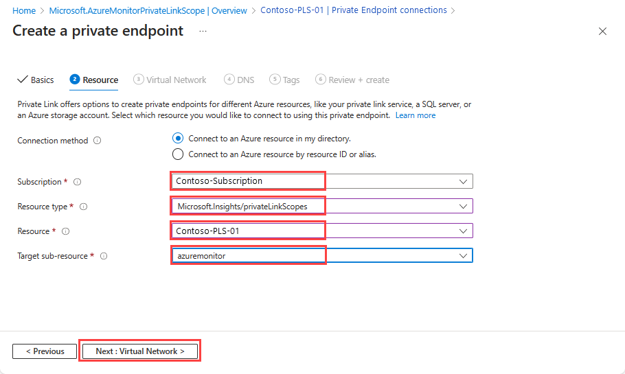 - 选择要连接到 Azure Monitor 资源的虚拟网络和子网。