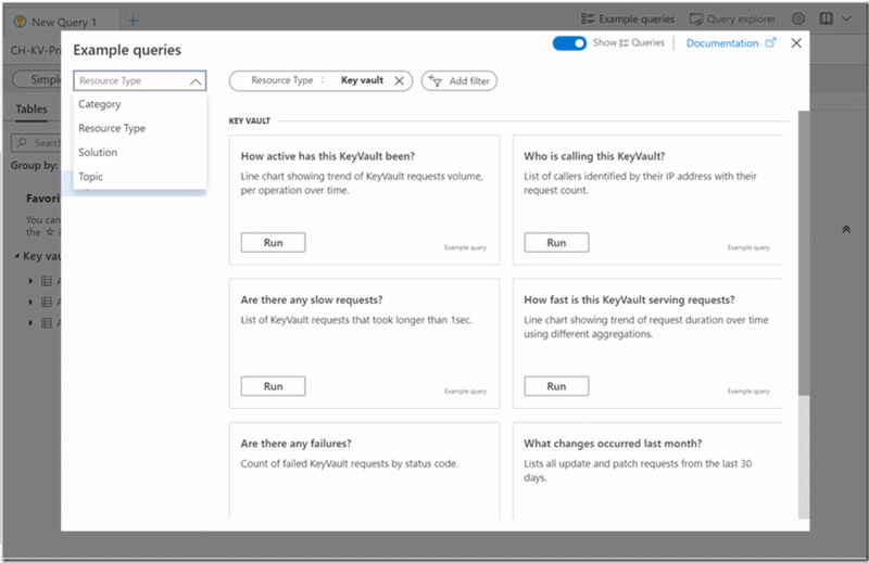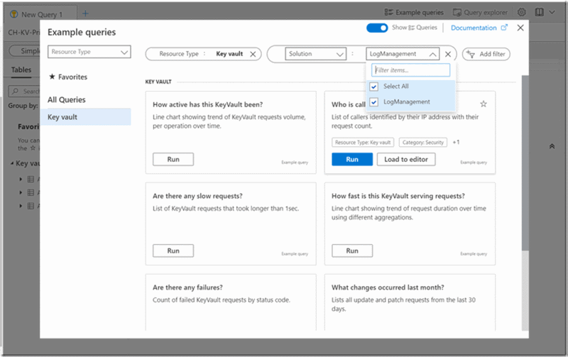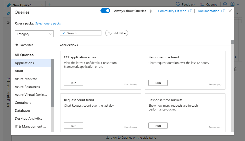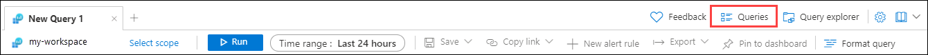 | 示例查询 | 示例查询可提供对资源的即时见解,并提供一种开始学习和使用 Kusto 查询语言 (KQL) 的方法。 示例查询有助于缩短开始使用 Log Analytics 所需的时间。 我们收集并策展了 500 多个示例查询,为你提供即时价值。 示例查询的数量在不断增加。 |