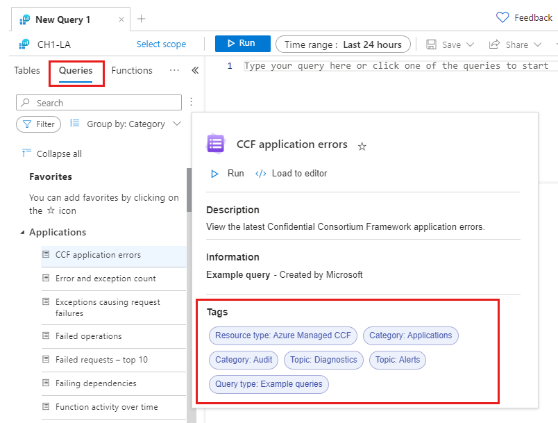 可从 Log Analytics 左侧边栏中的“查询”窗格访问与对话框体验完全相同的功能。 可将鼠标指针悬停在查询名称上来获取查询说明和其他功能。