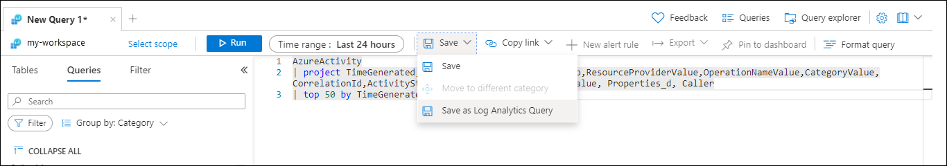 若要将查询保存到查询包,请从 Log Analytics 中的“保存”下拉列表中选择“另存为查询”。