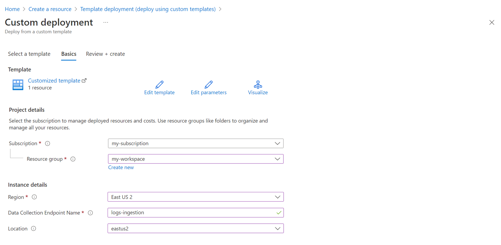 在“自定义部署”屏幕上,指定用于存储 DCR 的“订阅”和“资源组”。 然后提供模板中定义的值。 这些值包括 DCR 的“名称”和在上一步中收集的“工作区资源 ID”。 该“位置”应与工作区位于同一位置。 “区域”将已填充,并将用作 DCR 的位置。