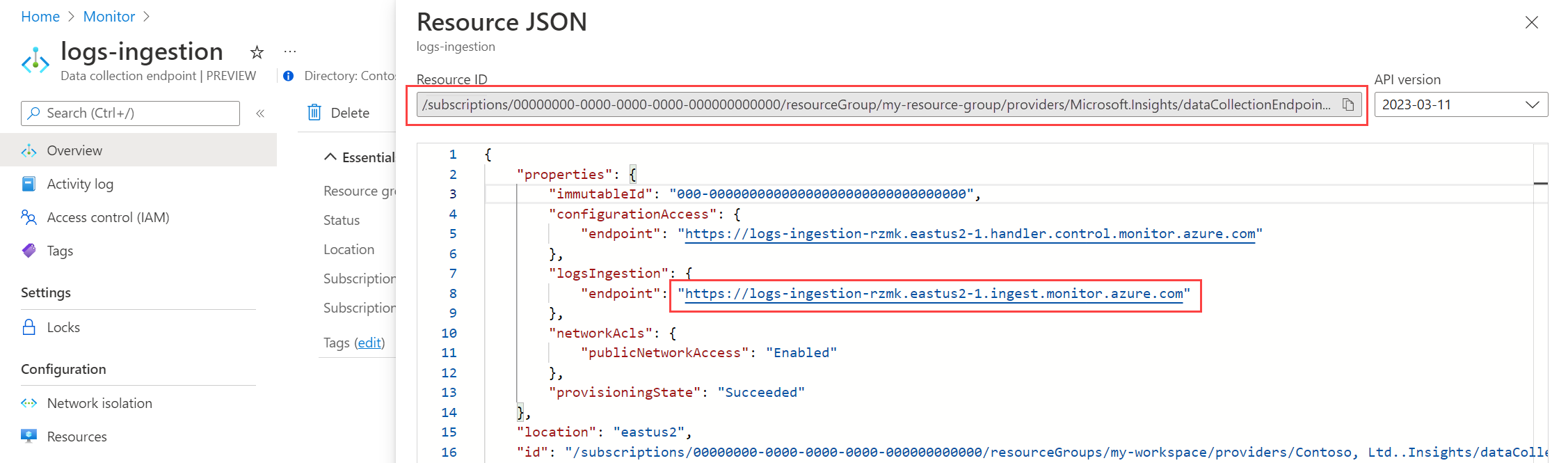 复制 DCR 的不可变 ID 和日志引入 URI。 使用 API 将数据发送到 Azure Monitor 时,你将使用这些数据。