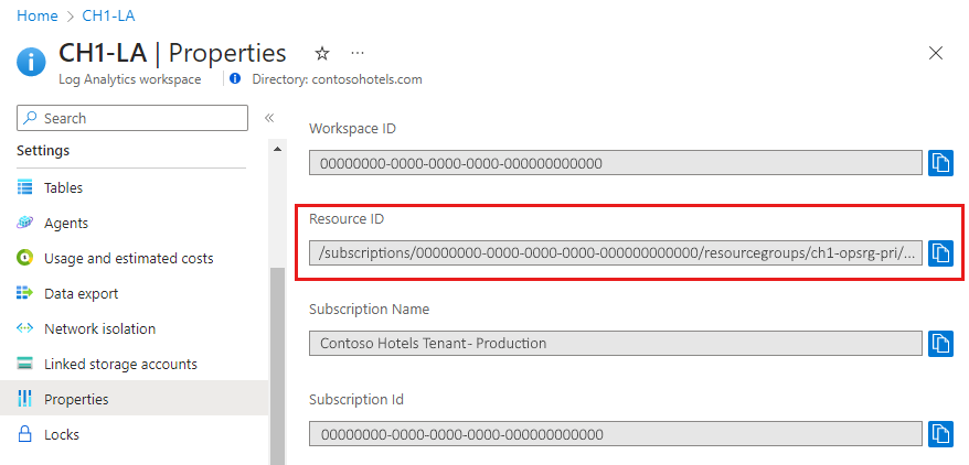 转到 Azure 门户中“Log Analytics 工作区”菜单中的工作区。 在“属性”页中,复制“资源 ID”并保存它以供稍后使用。