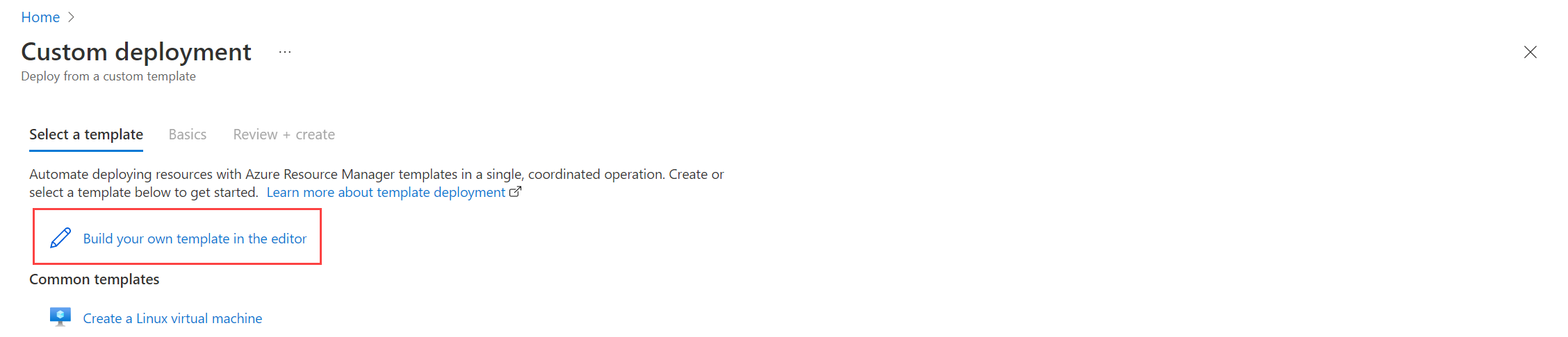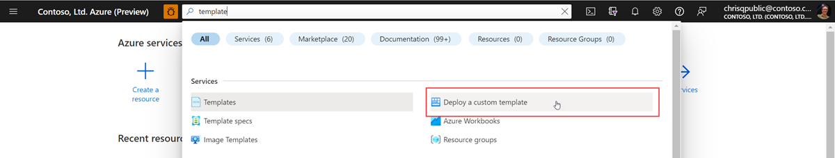 在 Azure 门户的搜索框中,输入“模板”,然后选择“部署自定义模板”。