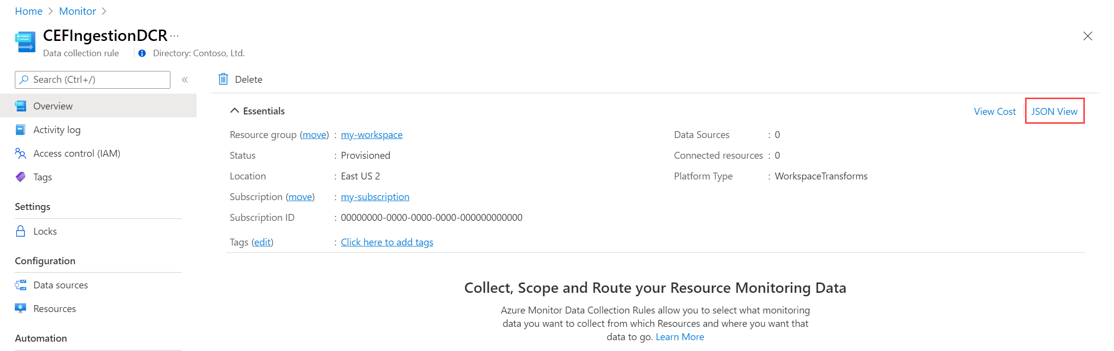 部署完成后,展开“部署详细信息”框,并选择你的 DCR 以查看其详细信息。 选择“JSON 视图”。