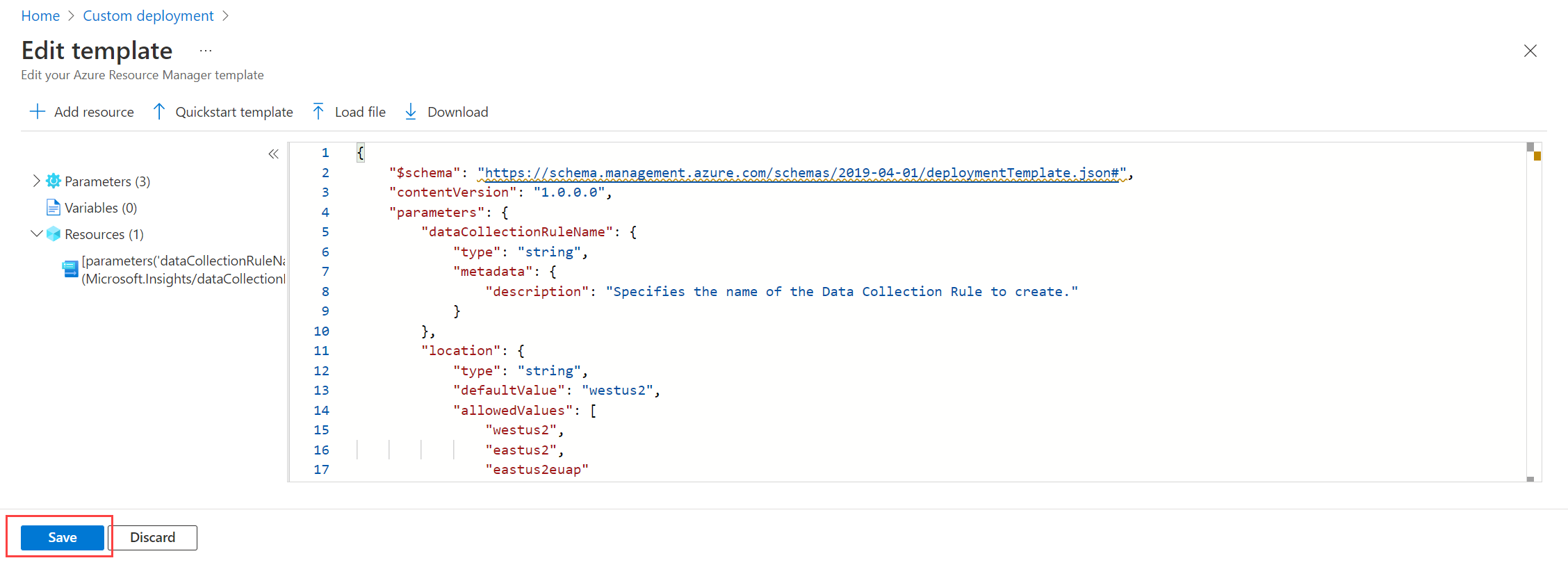将下面的 ARM 模板粘贴到编辑器中,然后选择“保存”。