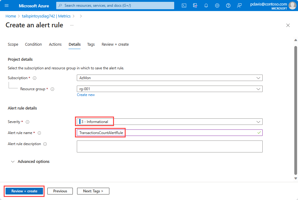 选择“查看 + 创建”以查看警报规则。