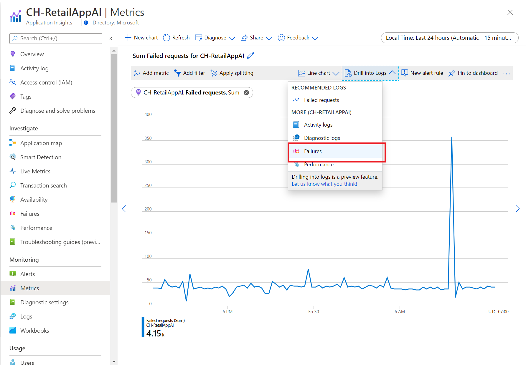 目前,“钻取日志”适用于选定的资源提供程序。 提供完整深入查看日志体验的资源提供程序包括 Azure Application Insights、Autoscale(自动缩放)、Azure 应用服务和 Azure 存储。