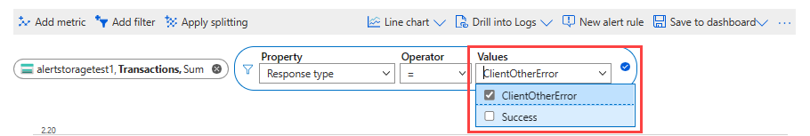 可以将筛选器应用到其指标拥有维度的图表。 请考虑一个具有“响应类型”维度的“事务计数”指标。 这个维度指示交易的响应是成功还是失败。 如果在此维度上进行筛选,指标资源管理器会显示表示仅成功事务或仅失败事务的图表行。