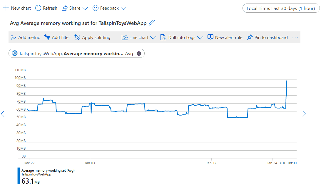 Azure 中的大多数指标将存储 93 天。 在任何单个图表中,可查询不超过 30 天的数据。 可以平移图表以查看完整的保留期。 30 天限制不适用于基于日志的指标。