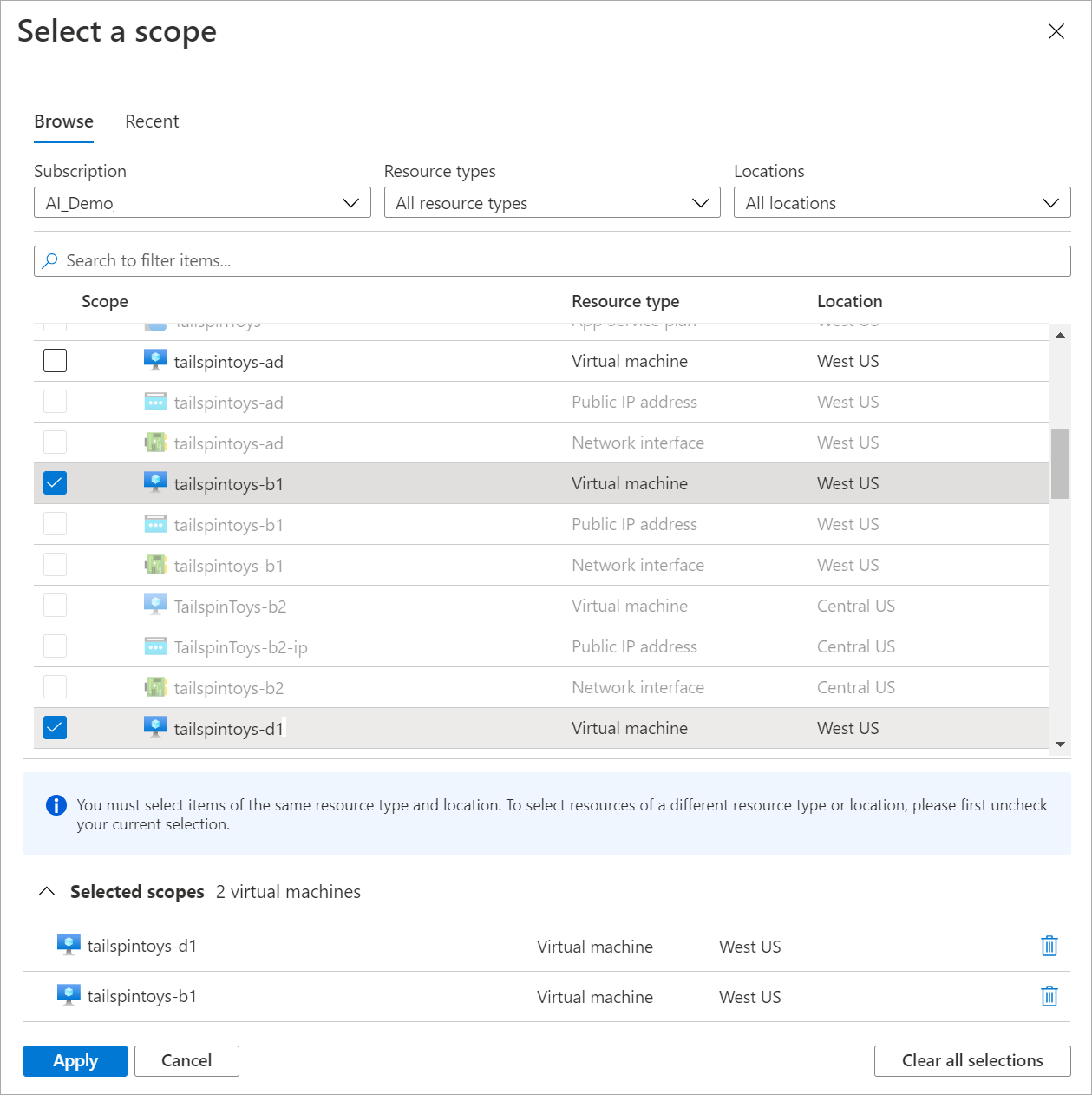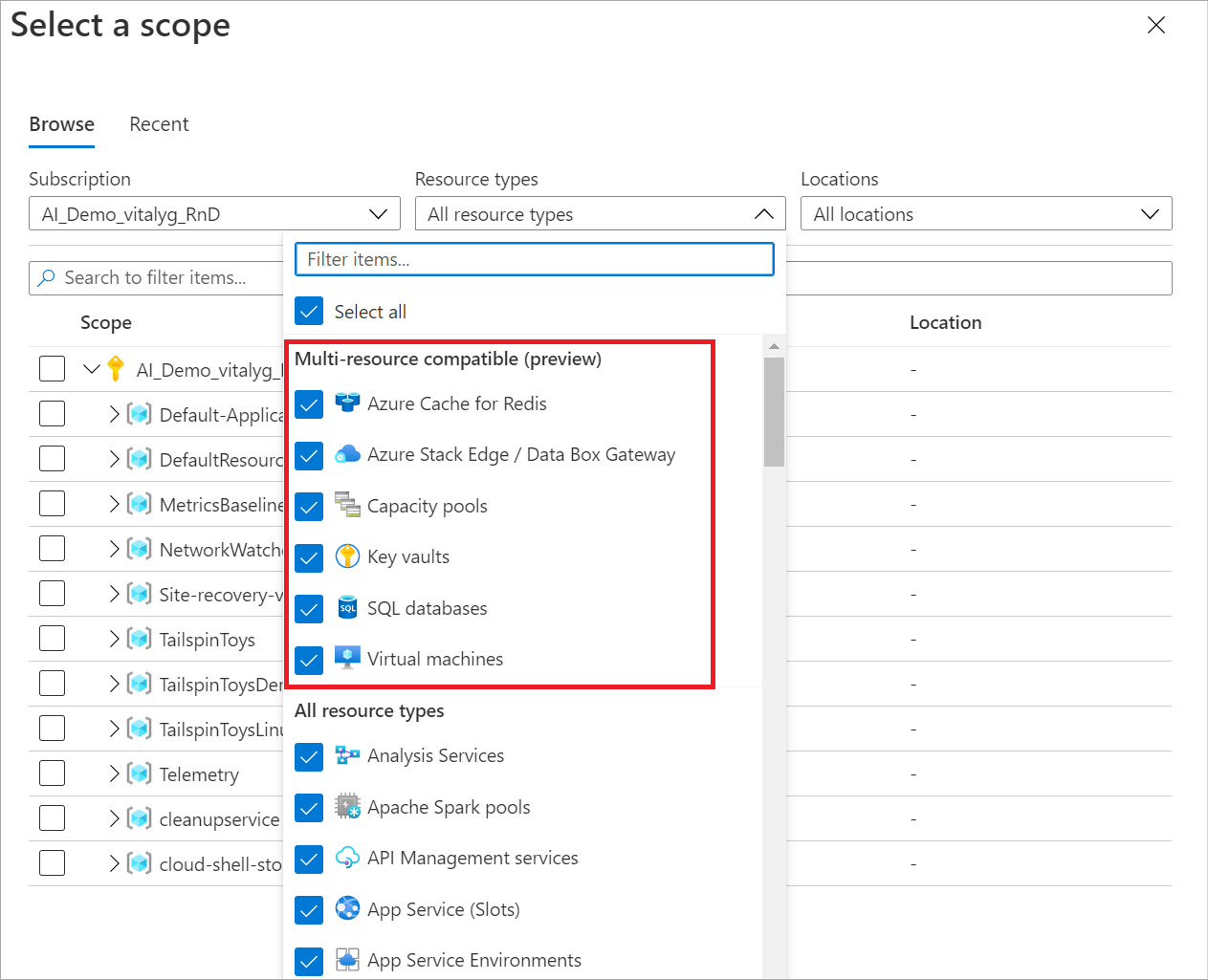 选择资源。 选取器会更新显示包含所选资源的所有订阅和资源组。