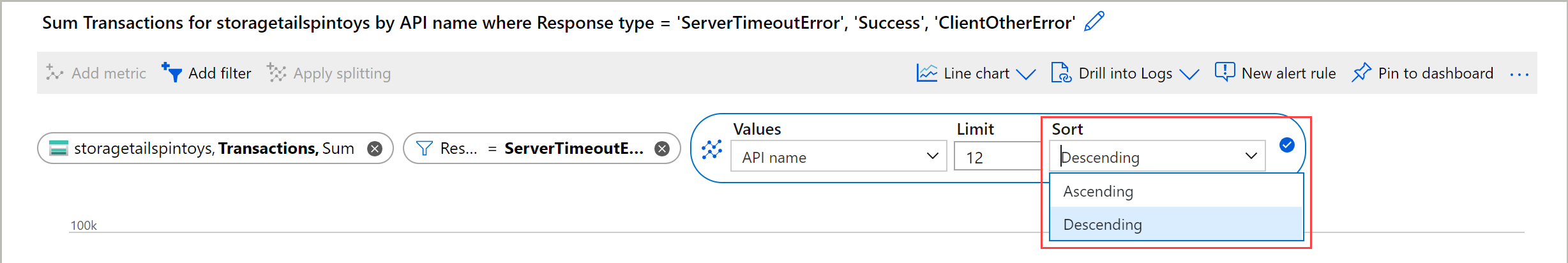 选择在按所选维度拆分后要显示的值的数量限制。 默认限制为 10,如上图所示。 限制范围为 1-50。