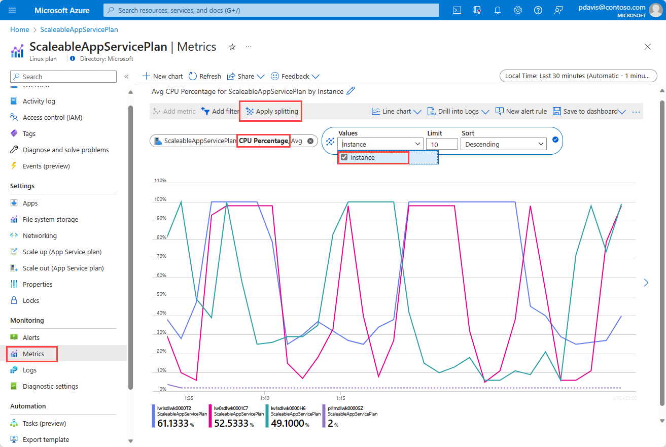 此图表显示应用服务计划的 CPU 使用率是否在可接受范围内,并按实例对其进行分解,以确定负载是否得到正确分发。