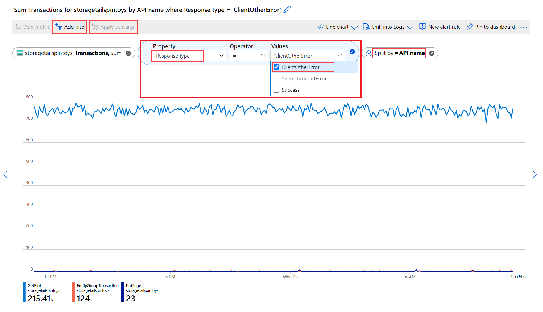 存储帐户资源遇到了过多失败的事务量。 使用事务指标来识别哪个 API 导致过多失败。 请注意,以下图表在拆分时配置了相同的维度(API 名称),并按失败的响应类型进行筛选:
