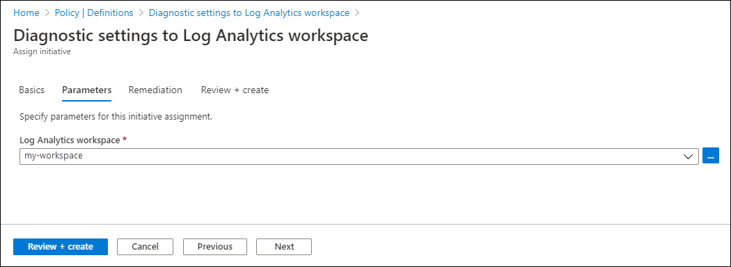 - 使用一个通用的计划参数,而不是为计划中包含的策略定义指定 Log Analytics 工作区和事件中心的详细信息。 此参数允许为所有策略定义指定通用值,并在必要时更改该值。