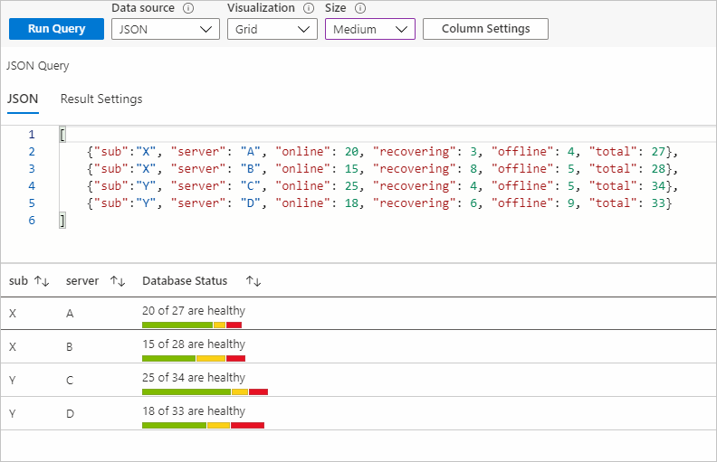 [ {"sub":"X", "server": "A", "online": 20, "recovering": 3, "offline": 4, "total": 27}, {"sub":"X", "server": "B", "online": 15, "recovering": 8, "offline": 5, "total": 28}, {"sub":"Y", "server": "C", "online": 25, "recovering": 4, "offline": 5, "total": 34}, {"sub":"Y", "server": "D", "online": 18, "recovering": 6, "offline": 9, "total": 33} ]运行查询。