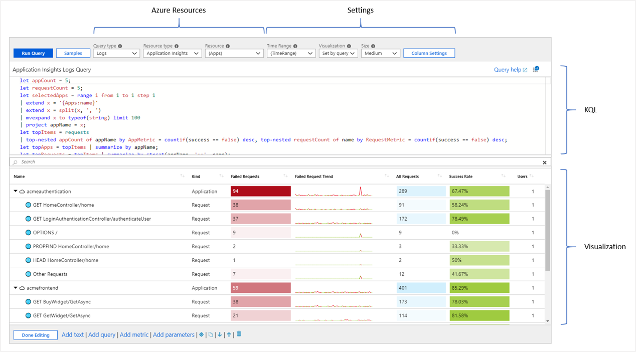 可以使用用于转换基础资源数据的 Kusto 查询语言 (KQL) 查询,以选择可作为文本、图表或网格可视化的结果集。
