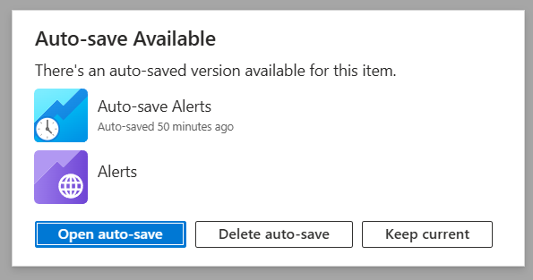 创建或编辑工作簿时,系统每隔几分钟会将更改本地保存一次。或者,你可以执行操作以打开其他 Azure 门户视图。 自动保存功能旨在帮助你在离开时关闭浏览器或登录过期时避免丢失工作。 自动保存会将数据本地保存到浏览器存储中;这些自动保存不会作为 Azure 资源保存,也不会与其他用户共享。 自动保存的工作簿在库中以特殊项的形式出现,以帮助识别它们。