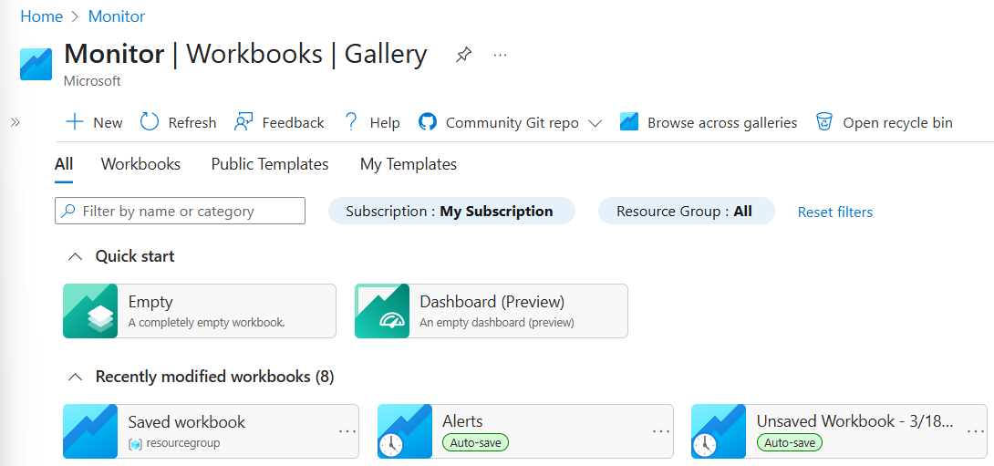 - 在 Azure 门户中,选择“监视器”,然后从左侧窗格中选择“工作簿”。