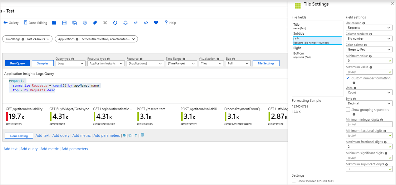 requests | summarize Requests = count() by appName, name | top 7 by Requests desc将“大小”设置为“完整”。