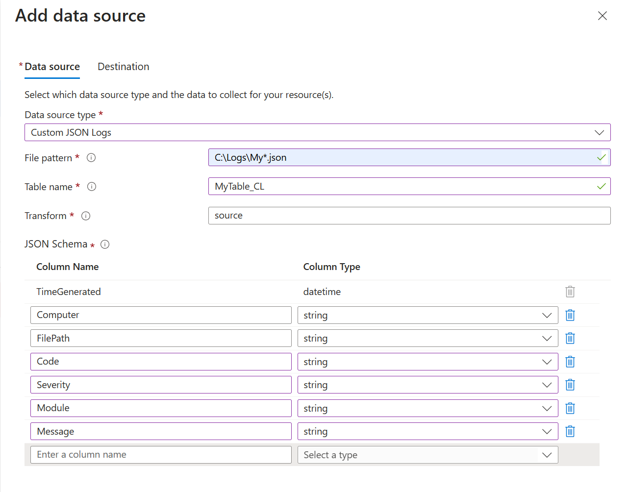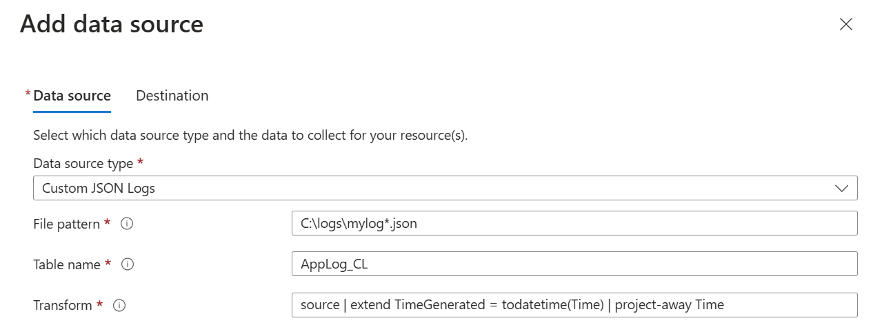 代理监视本地磁盘上与指定名称模式匹配的任何 json 文件。 在每个条目写入日志时进行收集,然后在发送到 Log Analytics 工作区中的指定表之前进行解析。 在创建 DCR 之前,Log Analytics 工作区中接收数据的自定义表必须存在。