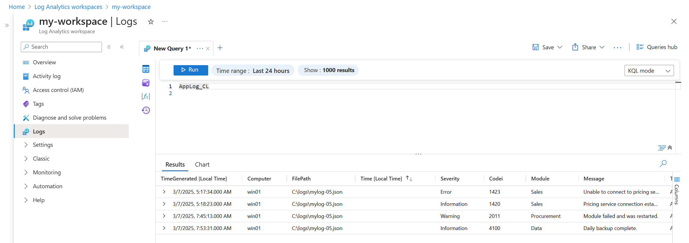 以下示例显示了一个查询,该查询从为示例 JSON 文件创建的表返回数据。 它使用 DCR 和 JSON 架构示例进行收集。 由于 JSON 数据不包含属性 TimeGenerated,因此使用引入时间。 列 Computer 和 FilePath 也会自动填充。
