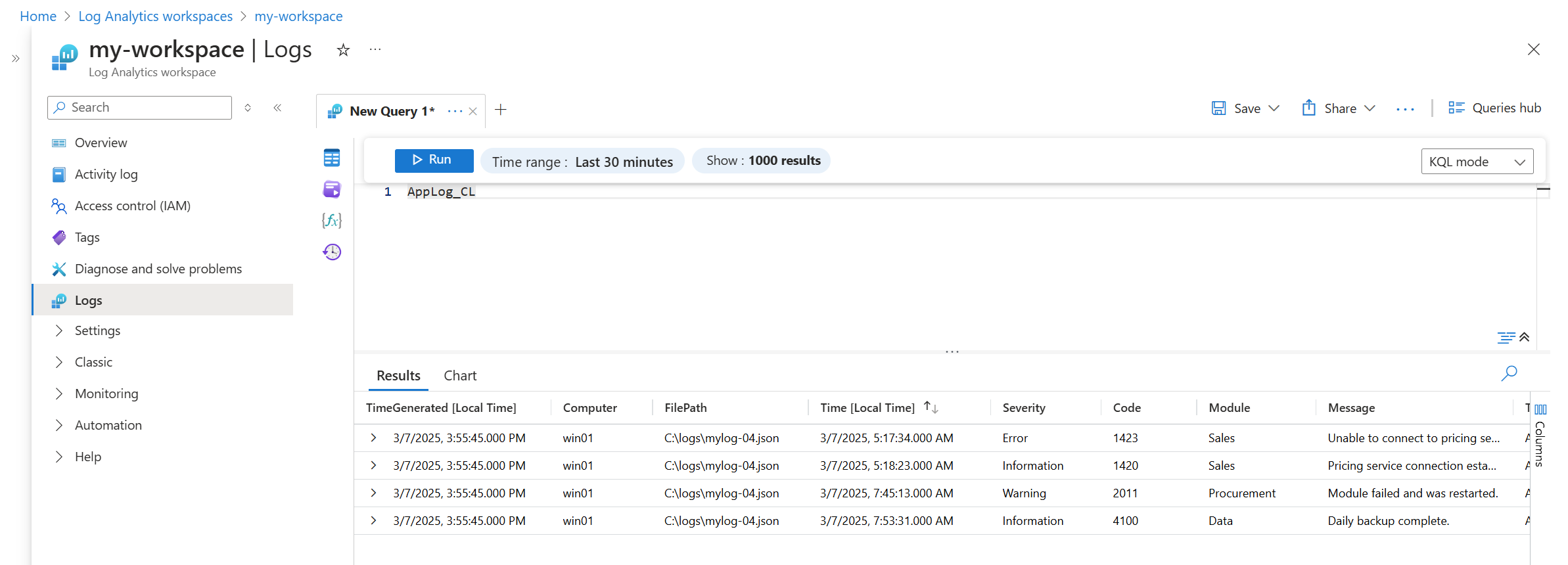 这将导致以下日志查询。 请注意,该 Time 列为空,该属性的值用于 TimeGenerated。