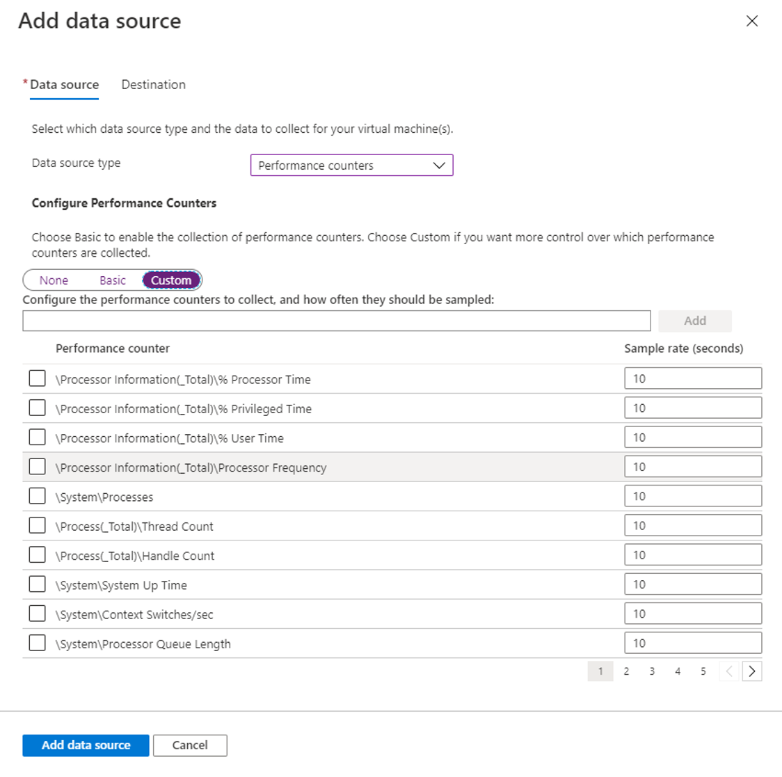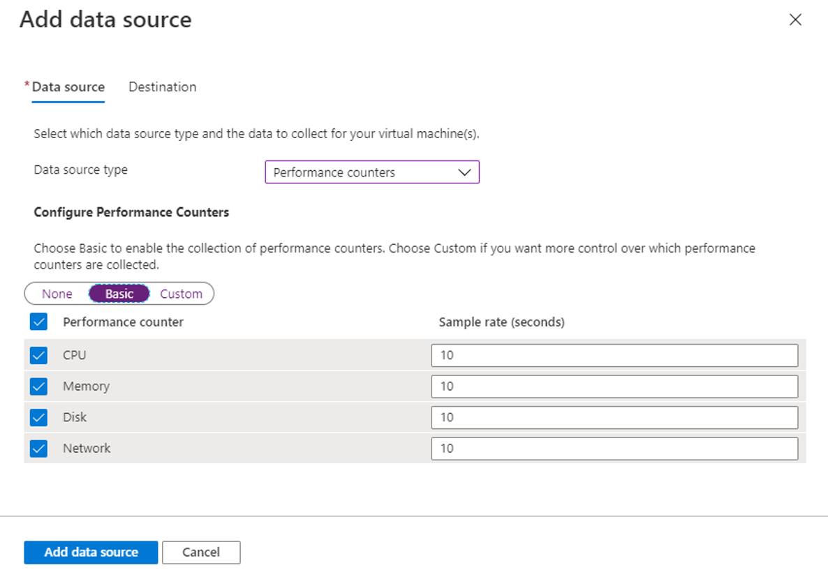 使用 通过 Azure Monitor 从虚拟机客户端收集数据 中的过程来创建 DCR。 在 DCR 的“收集和传递”选项卡上,从“数据源类型”下拉列表中选择“性能计数器”。 从预定义的一组对象和其采样率中进行选择。 采样率越低,收集值的频率就越高。