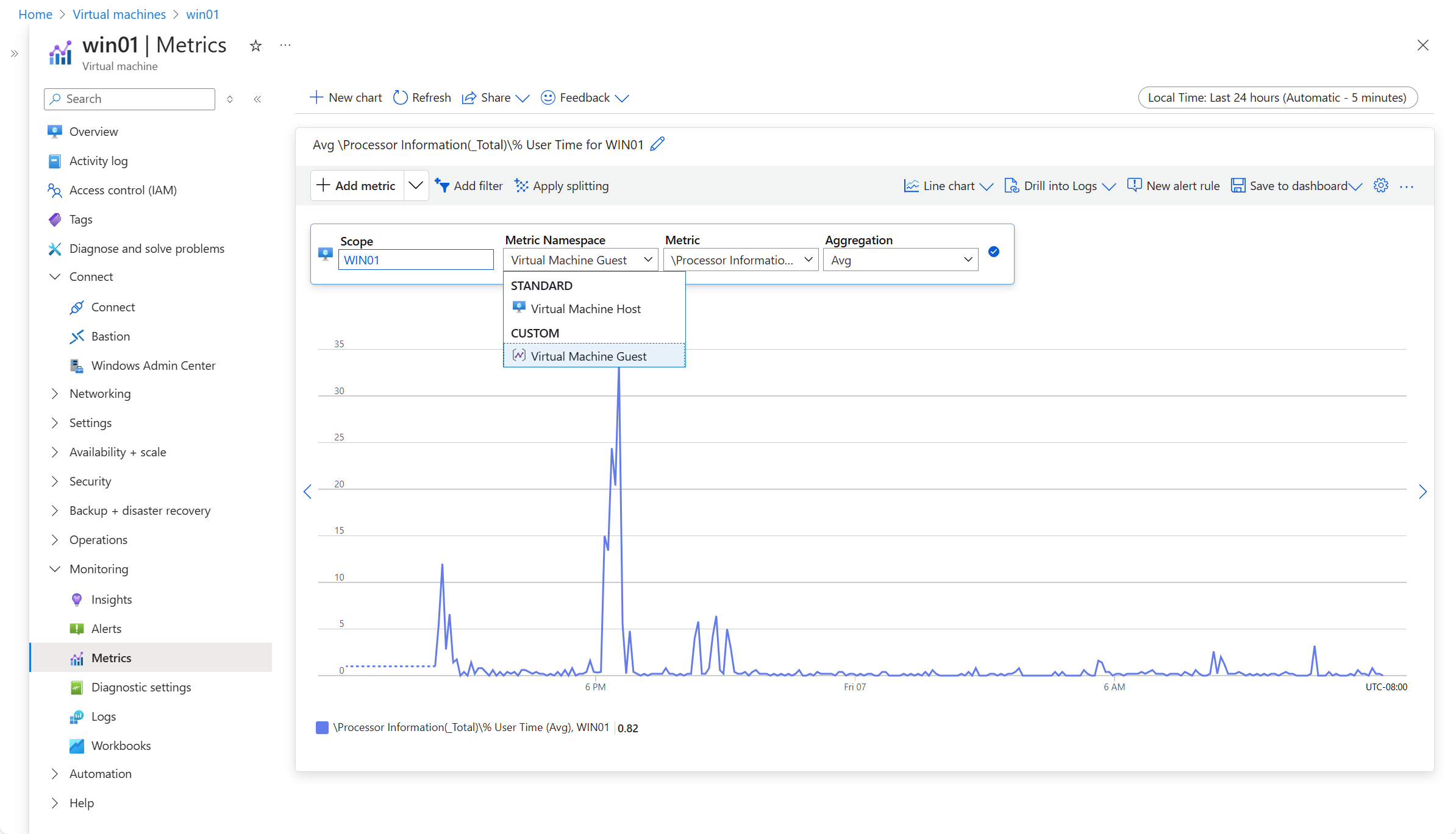 若要验证旧性能计数器数据源是否正在被收集到 Azure Monitor 指标中,请从 Azure 门户中的虚拟机中选择 Metrics。 为命名空间选择 Virtual Machine Guest (Windows) 或 azure.vm.linux.guestmetrics,然后选择要添加到视图的指标。
