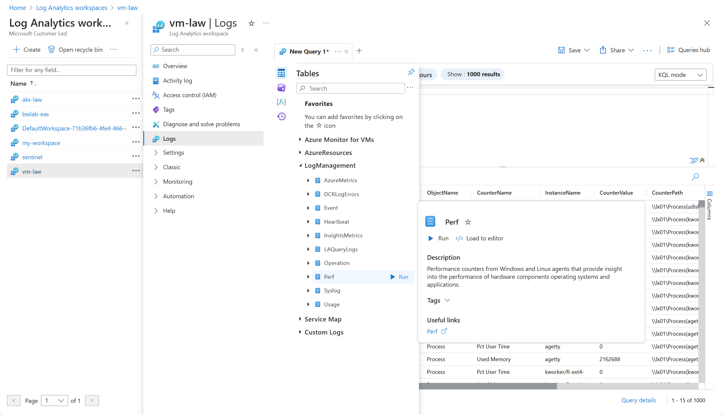 若要验证Log Analytics工作区中正在收集旧性能计数器数据源,请检查 Perf 表中的记录。 在虚拟机或 Azure 门户中的 Log Analytics 工作区中,选择 Logs,然后单击 Tables 按钮。 在“虚拟机”类别下,单击 Perf 旁边的“运行”。