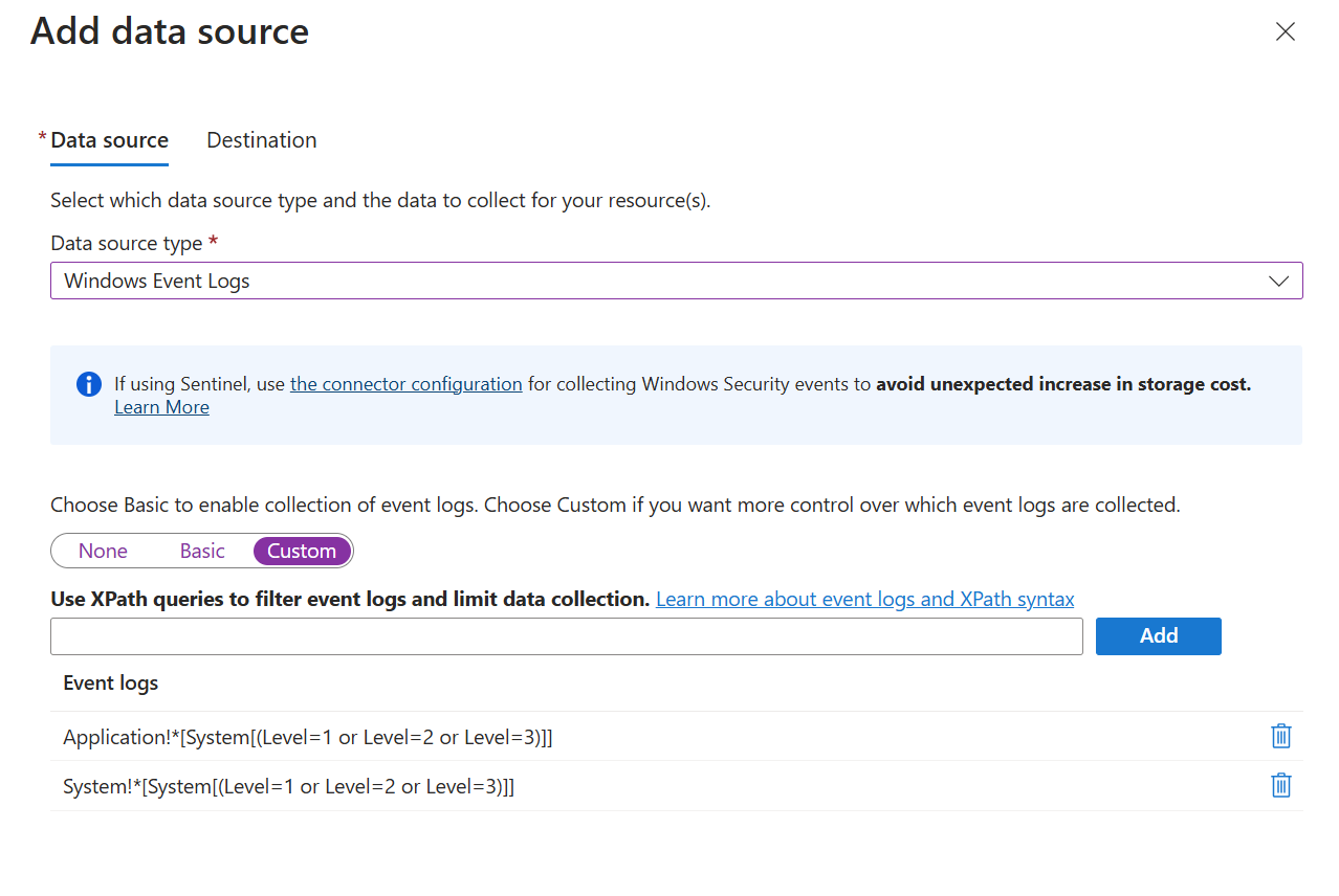 Azure 门户中的基本配置提供基于日志和严重性筛选事件的有限能力。 若要指定更精细的筛选,请使用自定义配置并指定仅筛选所需事件的 XPath。