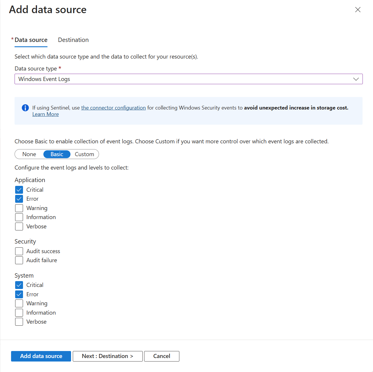 通过使用 Azure Monitor 从虚拟机客户端收集数据中的流程创建 DCR。 在 DCR 的“收集和传递”选项卡上,从“数据源类型”下拉列表中选择“Windows 事件日志”。 从一组日志和严重性级别中进行选择以进行收集。 仅收集具有每个日志所选严重性级别的日志。