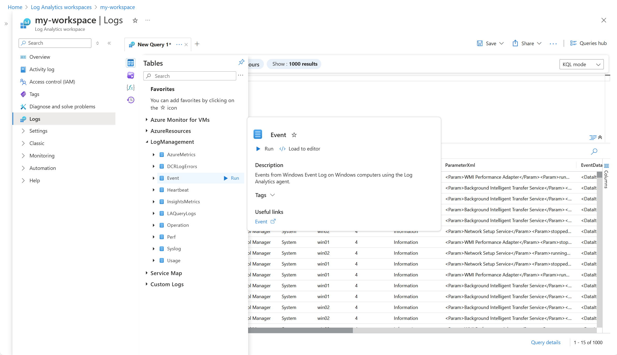 若要验证是否正在收集数据,请检查 事件 表中的记录。 在虚拟机或 Azure 门户中的 Log Analytics 工作区中,选择 “日志 ”,然后单击“ 表 ”按钮。 在“虚拟机”类别下,单击“事件”旁边的“运行”。