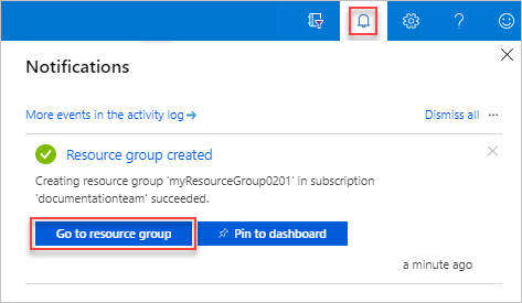 若要刷新资源组列表,请从顶部菜单中选择“ 刷新 ”。 若要打开新建的资源组,请从列表中选择它。 或者,从顶部选择 “通知 ”(钟形图标),然后选择“ 转到资源组 ”以打开新建的资源组。