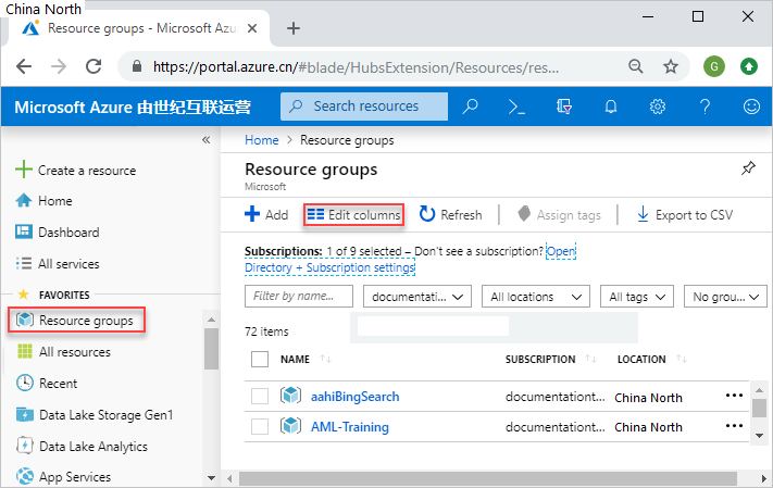 若要自定义显示的资源组信息,请配置筛选器。 以下屏幕截图显示了可添加到显示的其他列:
