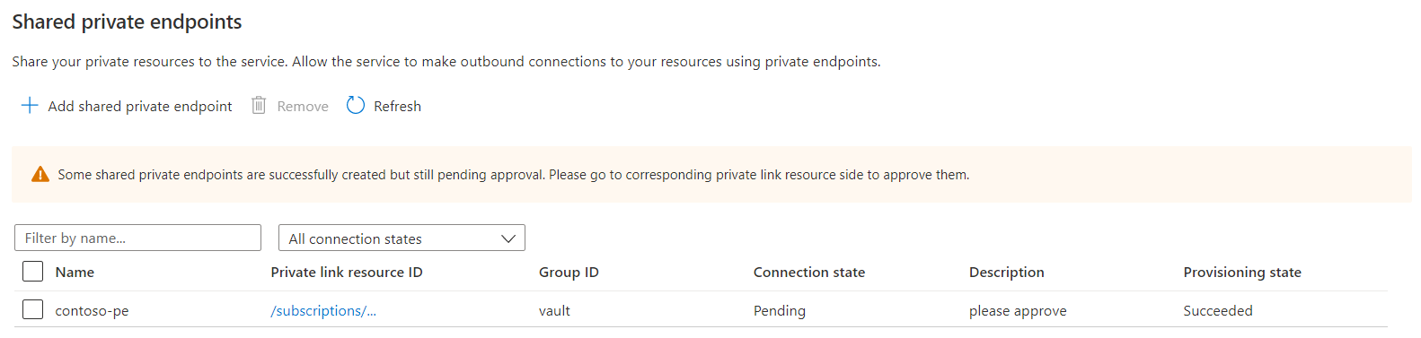 成功添加专用终结点后,预配状态将为“成功”。 在 Key Vault 端批准终结点之前,连接状态将为“挂起”。