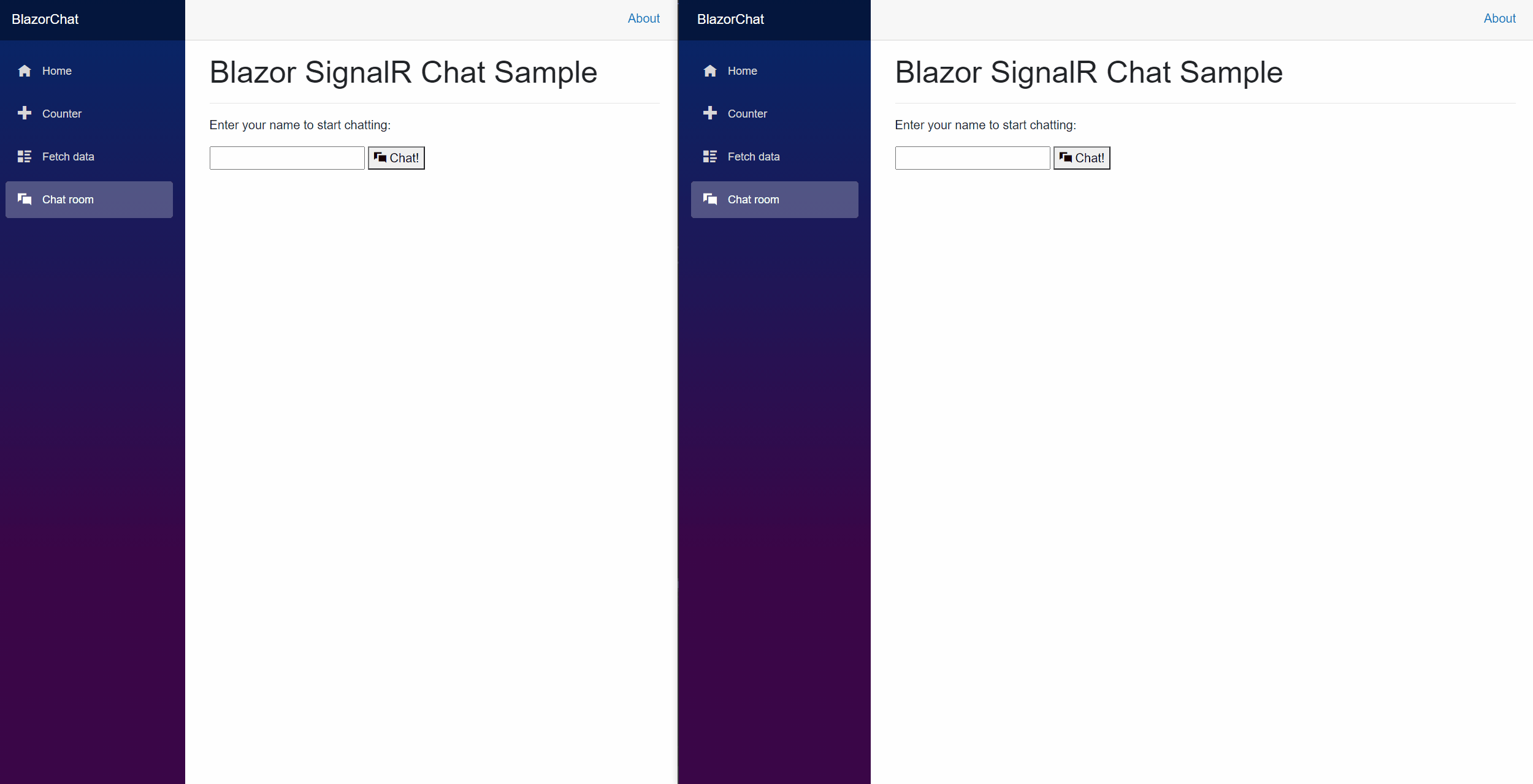 NavMenu.razor组件以插入新的NavLink组件,链接到NavMenuCssClass下的聊天室。<li class="nav-item px-3"> <NavLink class="nav-link" href="chatroom"> <span class="oi oi-chat" aria-hidden="true"></span> Chat room </NavLink> </li>向