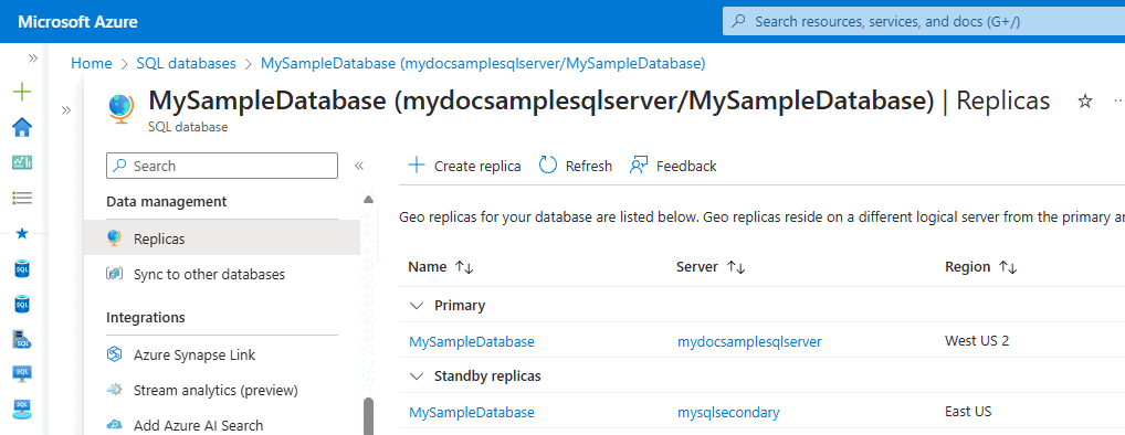 有关方法和分步说明,请参阅教程:配置活动异地复制和故障转移(Azure SQL 数据库)。