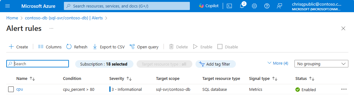 本文介绍如何使用 Azure 门户在 Azure SQL 数据库和 Azure Synapse Analytics 专用 SQL 池中设置警报。 当某些指标(例如数据库大小或 CPU 使用率)达到阈值时,警报可以向你发送电子邮件或调用 Webhook。